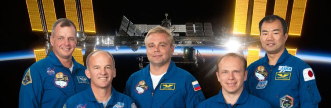 Image above: From the left (front row) are Commander Jeffrey Williams and Flight Engineer Oleg Kotov, flight engineer. From the left (back row) are T.J. Creamer, Maxim Suraev and Soichi Noguchi, all flight engineers.