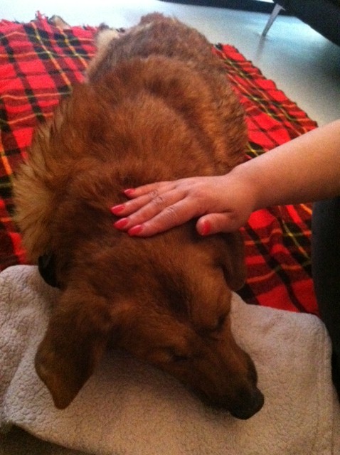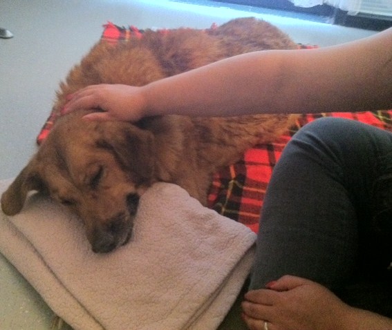 They put Cerbie in this nice little room- two Vets assistants had put her on a blanket and were sitting with her on the floor and petting her when me and Luis came into the room.